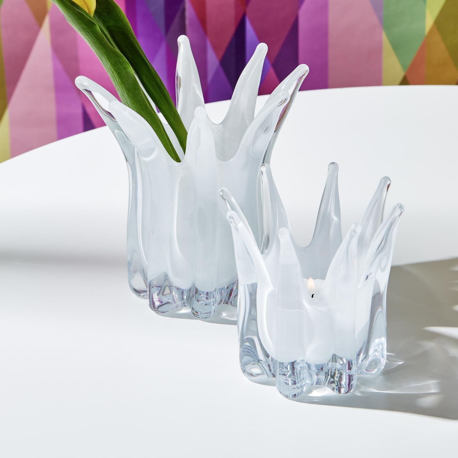Crafted in our glass studio by skilled glass artisans these glass candle holders or vases are sure to stand out as something unique and special. Each piece, hand-blown to perfection, showcases delicate white points creating a mesmerizing effect when lit or filled with blooms. The varying sizes offer versatility in styling, whether displaying a trio together on a mantel or scattering them throughout your home. Handcrafted with care, each piece is truly one-of-a-kind.