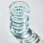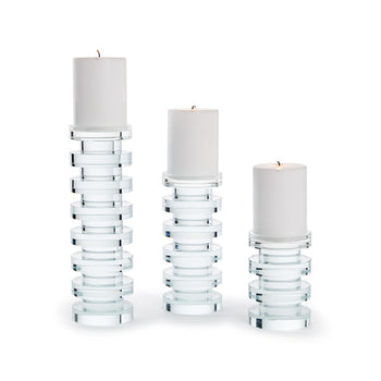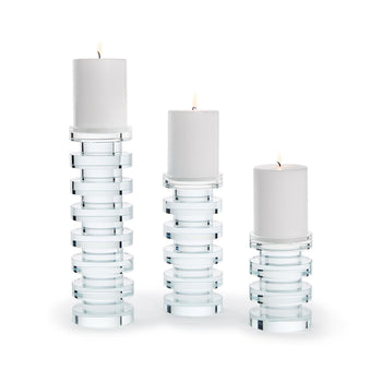 Illuminate your living space with the aureole candle holders. Crafted from crystal clear glass, this set of exquisite holders stand at 5 1/4", 8 1/4", and 11 1/4" tall, adding a touch of elegance to any room. Handmade with precision, each piece exudes sophistication and charm.