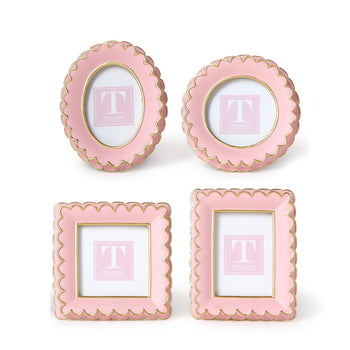Create a charming vignette in your home with our Set of 4 Pink Scalloped Mini Photo Frames. These delicate frames come in four unique styles - round, oval, rectangle, and square - adding a touch of elegance to any space. Handcrafted from resin, these frames are as durable as they are beautiful, showcasing your cherished memories with style.