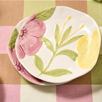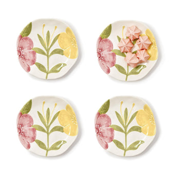 Enhance your table setting with this set of four tidbit plates. Each plate features a delicate hand-painted floral relief design, bringing a touch of garden-inspired elegance to your dining experience. Perfectly sized for serving appetizers or desserts, these plates add a touch of cheer to any occasion.