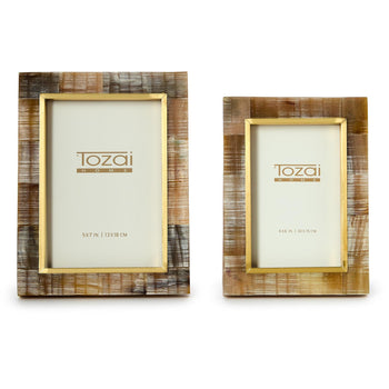 Capture cherished moments in style with our Well Defined Set of 2 Natural Chiseled Horn Photo Frames. Crafted from a blend of MDF, horn, bone, glass, and brass, these frames exude natural elegance. Perfect for showcasing your favorite 4" x 6" or 5" x 7" photos, they can stand horizontally or vertically, adding versatility to your décor. Handmade with precision, these frames are a unique addition to any space.