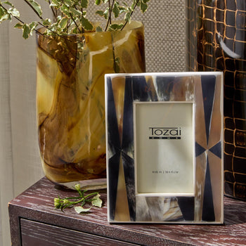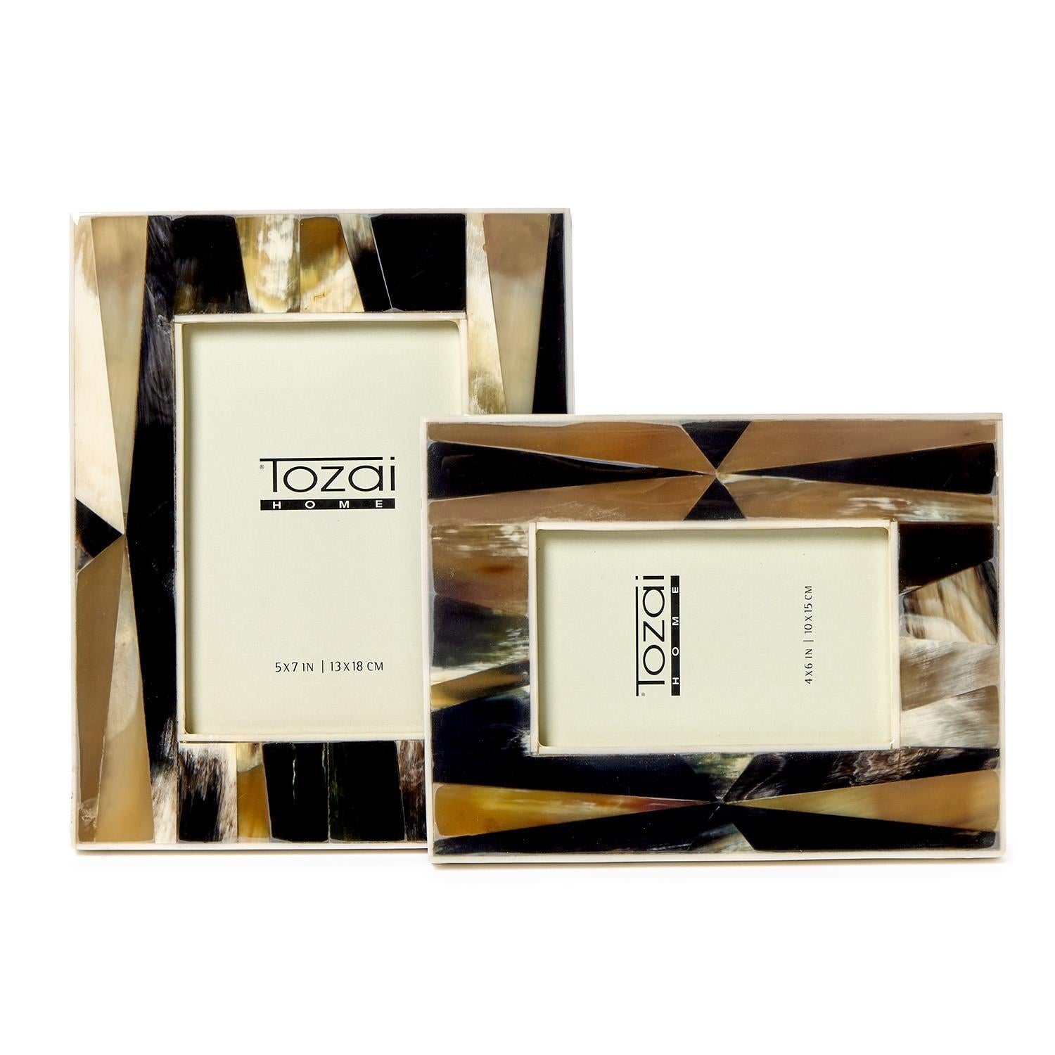 Capture your cherished memories with our exquisite Horn of Beauty Set of 2 Photo Frames. Crafted from genuine horn, these frames add a touch of elegance to any space. Whether displayed vertically or horizontally, these frames effortlessly showcase your favorite 4" x 6" and 5" x 7" photos. Each frame is meticulously handmade, ensuring a unique and one-of-a-kind piece for your home.