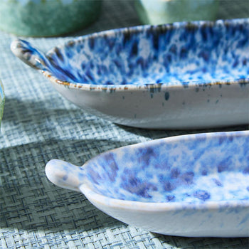 Elevate your entertaining with our Set of 2 Reactive Glaze Tidbit Servers. Crafted from exquisite stoneware, each piece is hand-wrought, ensuring a unique touch to your table setting. These servers are not just practical but also a work of art, with variations in color that add character and charm. Perfect for serving appetizers or displaying trinkets, these servers will be a delightful addition to your home decor.