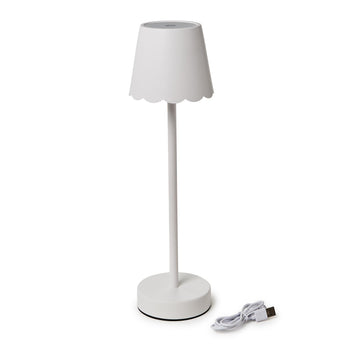 Transform your space with the elegance of the White LED Cordless Table Lamp from Two's Company. This stunning lamp features a scalloped edge shade for a touch of sophistication. With a 4000 mAh rechargeable battery and USB cable included, this lamp offers convenience and portability. Enjoy the ambiance with 3 color stepless dimming options and LED settings in warm white, cool white, and daylight hues. Handcrafted from iron, this lamp stands 14 1/2" tall and has a diameter of 4 1/2". Elevate any room with the perfect lighting solution.