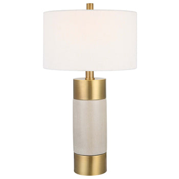Sophisticated And Versatile, This Table Lamp Displays A Solid Iron Base Finished In Warm Brushed Brass With An Ivory Crackle Glazed Ceramic Center. The Hardback Drum Shade Is Covered In A White Cotton Fabric.