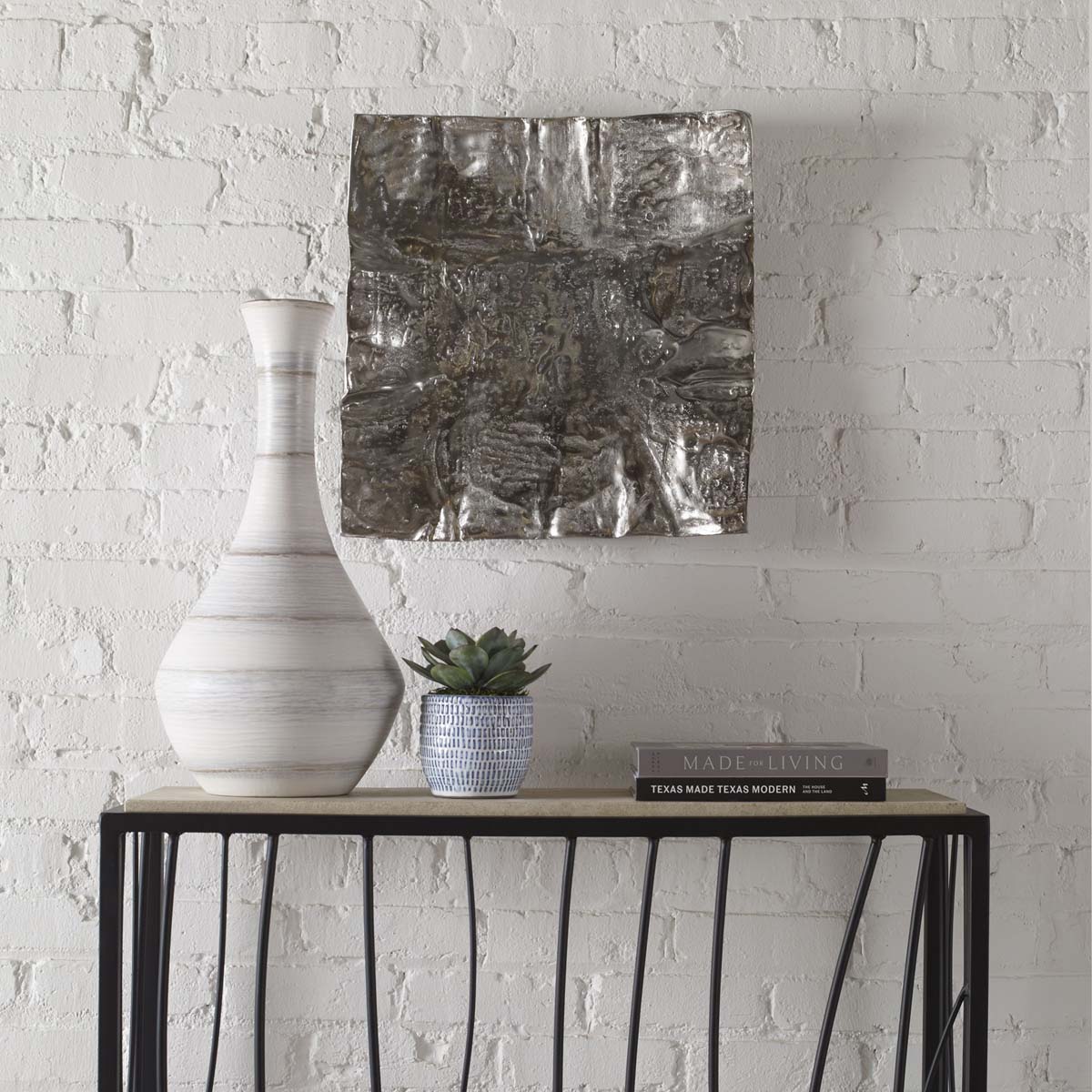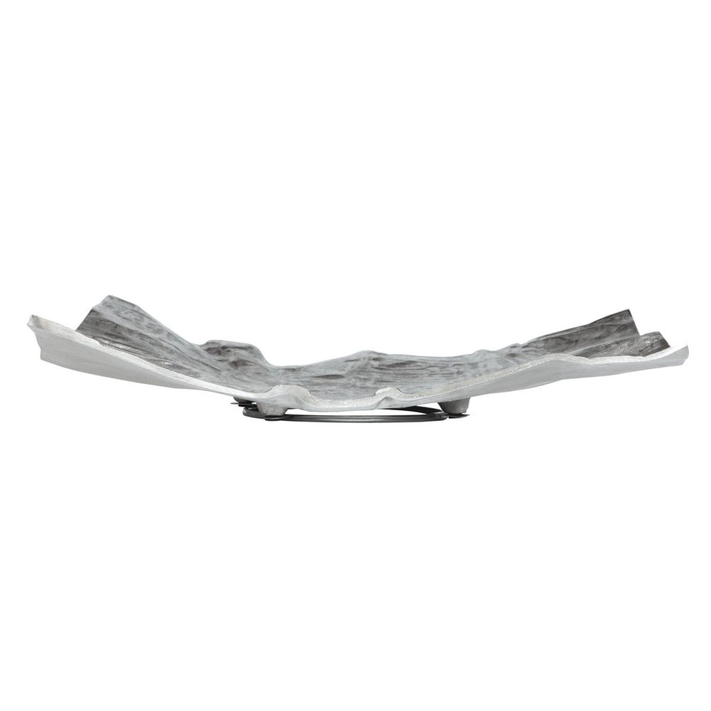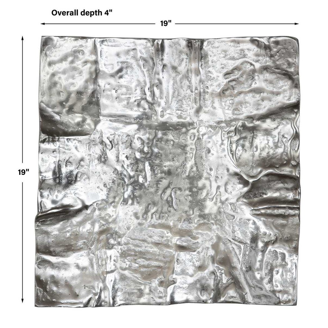 Handcrafted Cast Aluminum Wall Accent Showcases A Heavily Textured Organic Shape In A Nickel Plated Finish. A Circular Hanger On The Back Provides Countless Hanging Options, Enabling Truly Unique Wall Designs. Felt Pads Also Included For Use As A Tabletop Tray.