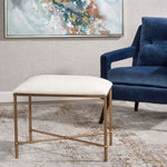 Thoroughly Modern Yet Inspired By The Classics, This Small Bench Displays A Stylish Iron Frame In A Rich Antique Gold Finish, Upholstered In A Crisp White Textured Fabric.