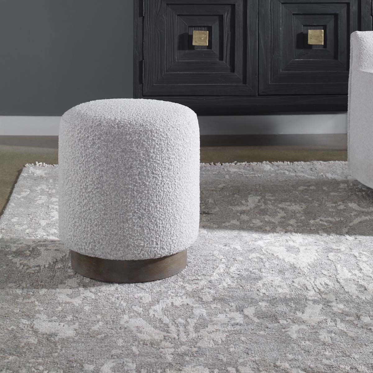 This Plush Ottoman Is Covered In A Casual Ivory And Warm Gray Boucle Fabric With A Natural Walnut Stained Oak Base. Versatile And Stylish, This Piece Can Be Used As A Seat Or Footrest, Grouped Together Or As A Singular Accent Piece.