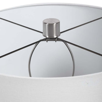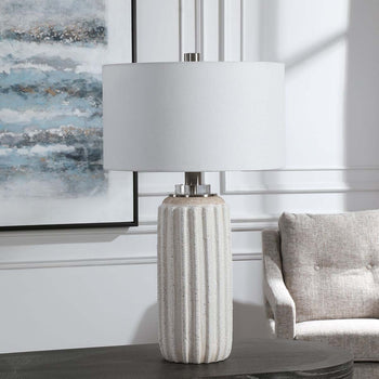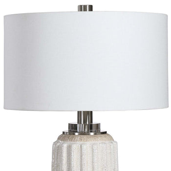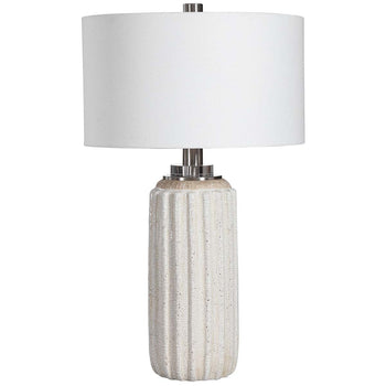 A Nod To Old-world Style, This Ceramic Table Lamp Features A Distressed Cream And Beige Crackle Glaze With A Deep Ribbed Texture, Accented By Brushed Nickel And Crystal Details. A White Linen Fabric Drum Shade Completes The Look.