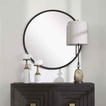 This Sophisticated Round Mirror Showcases A Solid Iron Frame With A Raised Rounded Edge Finished In An Aged Black. The Simplicity Of The Design Enables Easy Placement In An Array Of Styled Spaces.