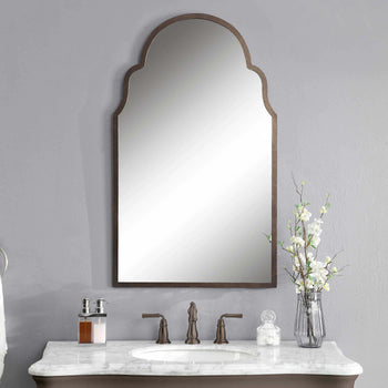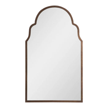 This Shaped Mirror Features A Hand Forged Metal Frame Finished In Lightly Textured, Dark Brown With Burnished Edges And Gold Highlights.