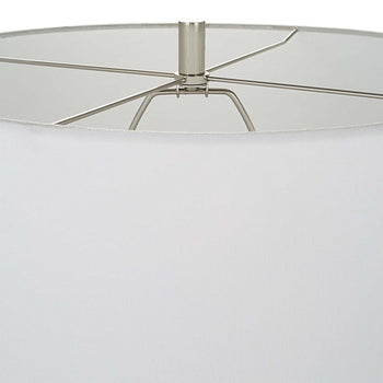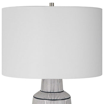 Inspired By The Classic Nautical Stripe Knit, This Ceramic Table Lamp Sports A Satin White Glaze With Rich Navy Blue Stripes And Polished Nickel Plated Accents. The Hardback Drum Shade Is Covered In A Crisp White Linen Fabric.