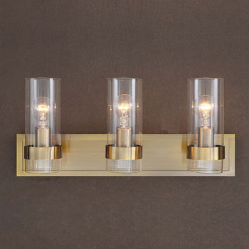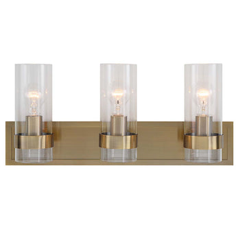 Clean Modern Lines Enhance This 3 Lt. Vanity Featuring A Wide Rings Holding The Clear Cylinder Glass Yielding A Floating Effect, Finished In A Warm Oxidized Antique Brass. With 3-60 Watt Max, Edison Sockets.