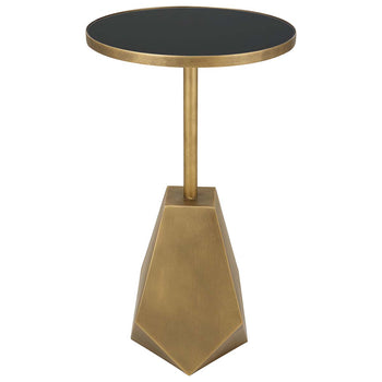 A Whimsical Geometric Accent, This Table Features A Multi-faceted Iron Base Finished In Antique Bronze, With A Sleek Black Glass Top.