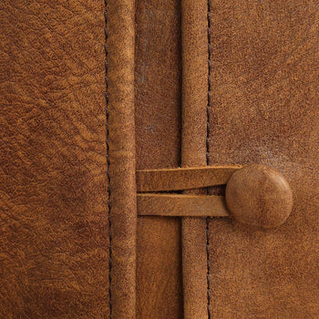 Thick Top Grain Nubuck Leather Slipcover Chair In A Distressed Hand-sanded Cognac With A Tailored Double Stitched Design And Casual Flange Edges, Featuring A Button Closure Back. Because Leather Is A Natural Product, Both Texture And Color Will Vary Slightly From Hide To Hide And Within The Same Hide. Slipcovers Packaged Separately. Sold As A Set Of 2. Seat Height Is 19".