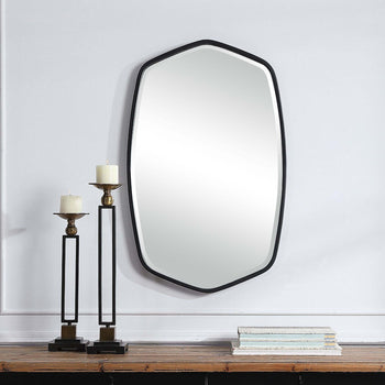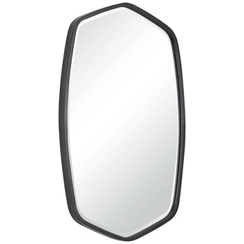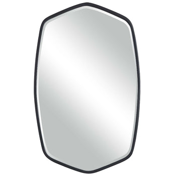 This Hand Forged Iron Mirror Frame Features A Unique Shape With Elegant Curves, Finished In A Streamlined Satin Black. Mirror Has A Generous 1 1/4 Bevel.