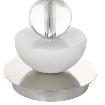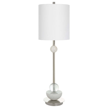 Sleek And Refined, This Contemporary Buffet Lamp Showcases A Streamlined Iron Base In Polished Nickel With Natural White Marble And Crystal Accents. Paired With A Hardback White Linen Fabric Drum Shade.