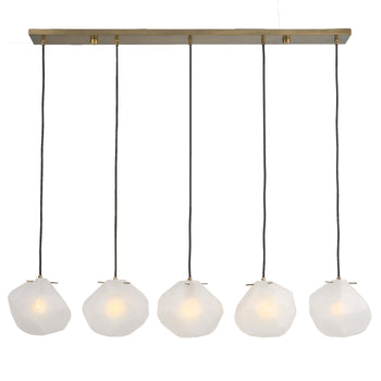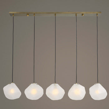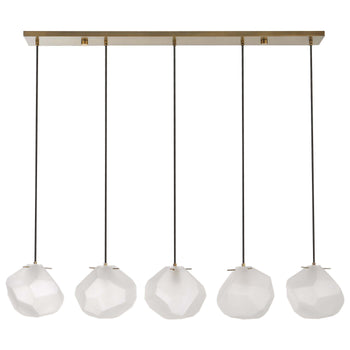 This Clean Linear Shaped 5 Lt Pendant Features Frosted 8 Geometric Shaped Glass As Its Celestial Focal Point Accented With A Rich Matte Antique Brass Finish. Each Pendant Is Supplied With 15' Of Black Fabric Covered Wire For Adjustable Heights For Installation With 5-60 Watt Max Candelabra Sockets.