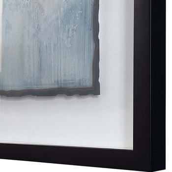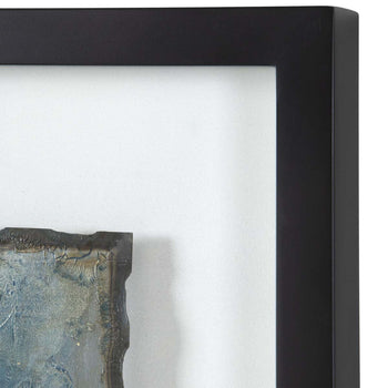 Inspired By Natural Gemstones, These Metal Sheets Are Hand Painted In Blue, Turquoise, White And Gold Leaf. The Raw Metal Edge Is Softened By Oatmeal Linen Backing And A Black Shadow Box Style Frame Under Glass. Due To The Handcrafted Nature Of This Artwork, Each Piece May Have Subtle Differences.