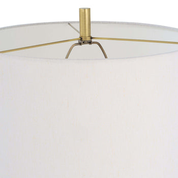 This Sophisticated Design Showcases A Sleek Iron Base Finished In A Lightly Antiqued Plated Brass, Accented By A Substantial Black Marble Column Above The Foot. The Round Hardback Shade Is Covered In A White Linen Fabric.