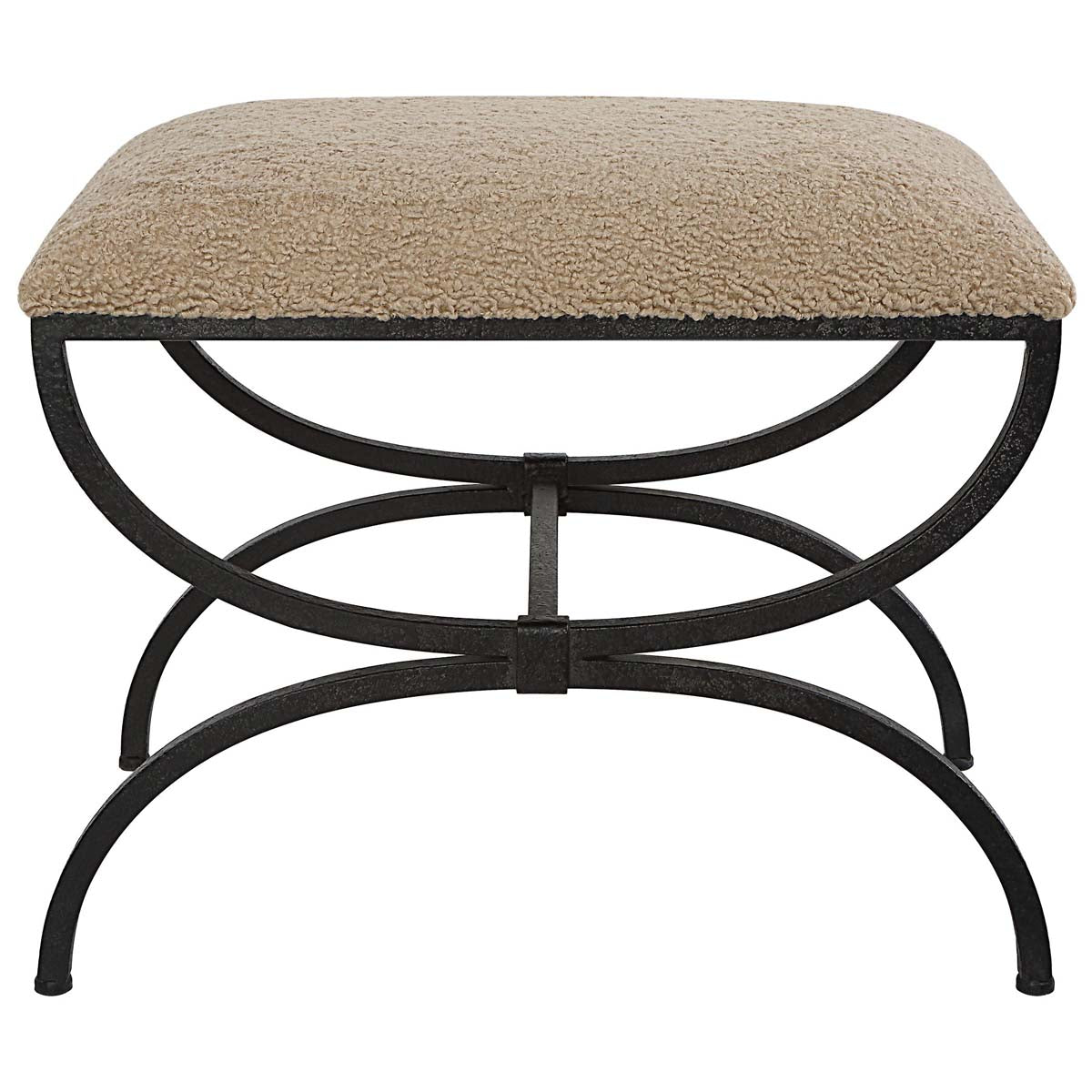 Influenced By Spanish Architecture, This Small Bench Features A Heavily Textured Iron Base Finished In Aged Black Topped With A Plush Faux Shearling In Latte.