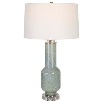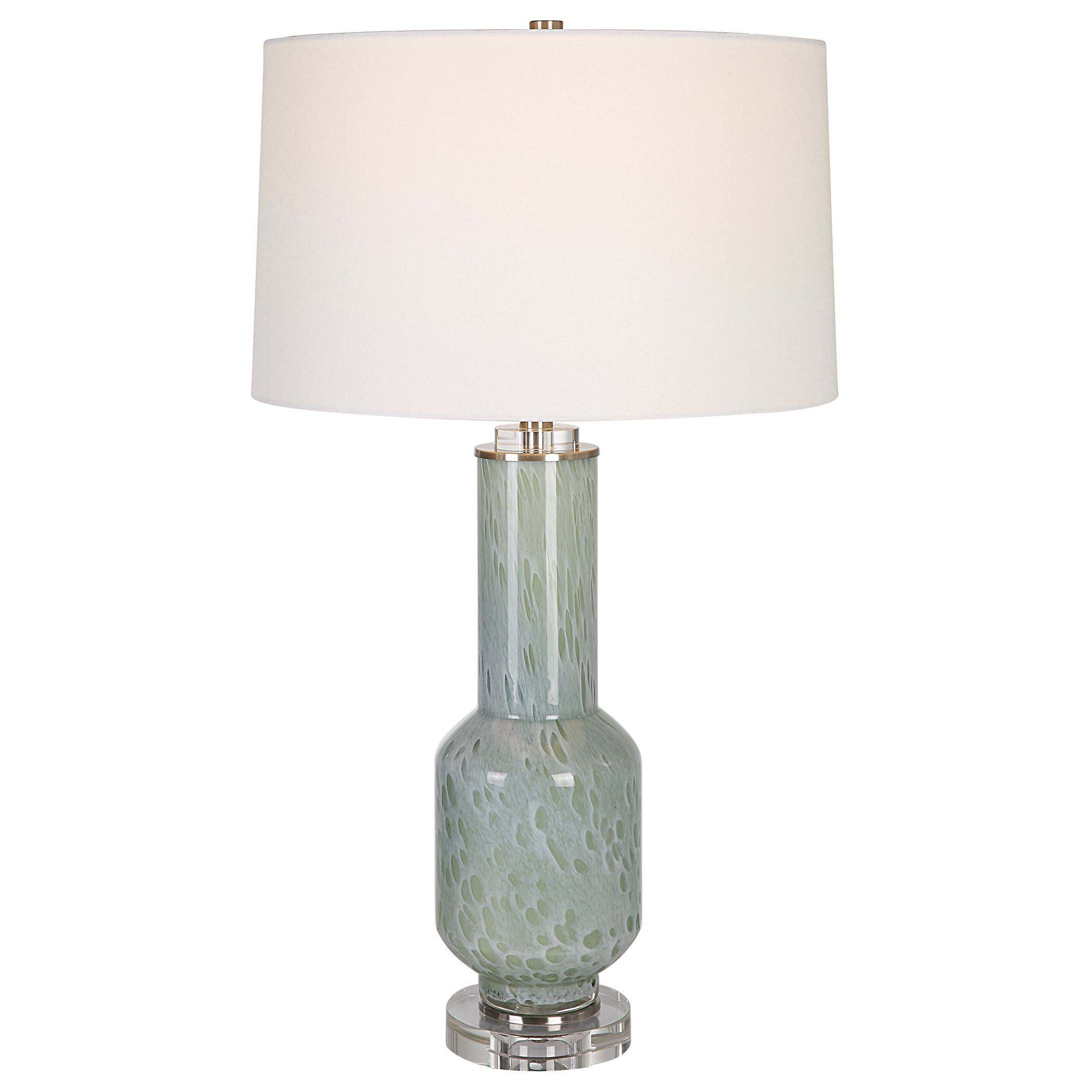 This Sophisticated Lamp Displays A Unique Bubble Glass Base In Tranquil Aqua Gray With Plated Brushed Nickel Accents And Thick Crystal Details. Tapered Hardback Shade Is Covered In A Crisp White Linen Fabric.