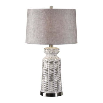 Uttermost's Lamps Combine Premium Quality Materials With Unique High-style Design.With The Advanced Product Engineering And Packaging Reinforcement, Uttermost Maintains Some Of The Lowest Damage Rates In The Industry. Each Product Is Designed, Manufactured And Packaged With Shipping In Mind. Embossed Ceramic, Featuring A Subtle Tribal Pattern, Finished In A Lightly Distressed Glossed White Glaze, Accented With Brushed Nickel Plated Details. The Slightly Tapered Round Hardback Shade Is A Light Gray Beige Linen Fabric. Due To The Nature Of Fired Glazes On Ceramic Lamps, Finishes Will Vary Slightly.