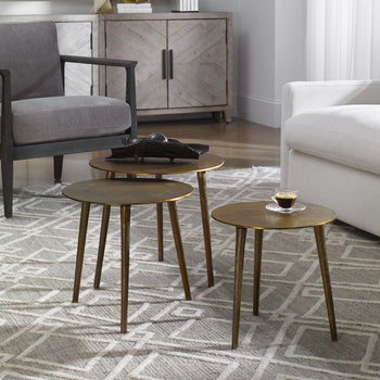 Set Of Three Nesting Coffee Tables Are Made From Cast Aluminum With Noticeable Texture And Are Finished In Oxidized Antique Gold. Varying Heights Offer Unique Display Opportunities. Sizes: Sm-14x14x14, Med-16x15x16, Lg-18x17x18