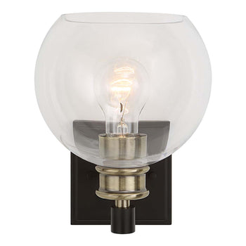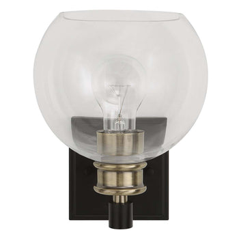 Timeless Lines Make This 1 Lt. Sconce An Understated Classic. Finished In A Combination Of Matte Black & Plated Antique Brass Then Topped With Sparkling Clear Round Glass Shade. With 1-60 Watt Max, Edison Socket.