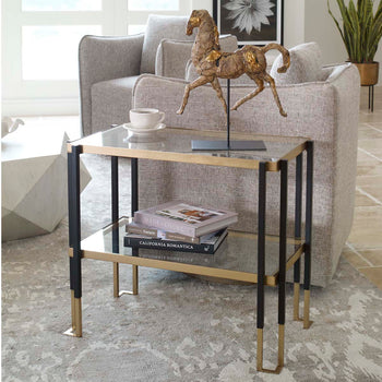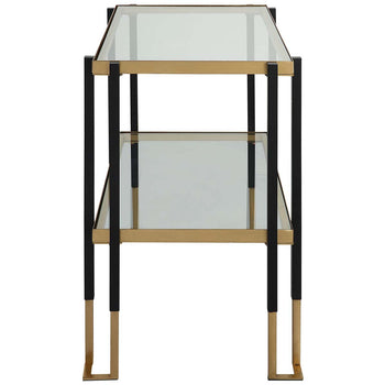 Featuring A Clean Lined Solid Iron Frame, This Contemporary Table Is Finished In A Two-toned Matte Black And Brushed Gold. Has Two Tempered Glass Shelves.
