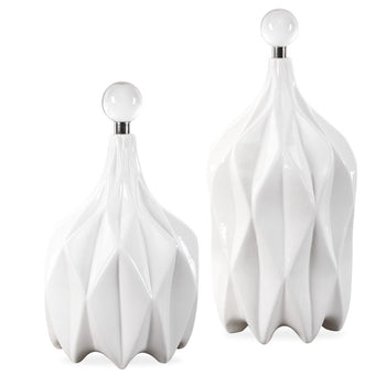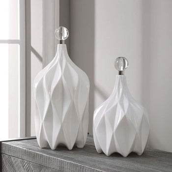 Modern Style Emanates From This Set Of Decorative Ceramic Bottles With An Embossed Geometric Pattern, Finished In A Glossy White And Accented With Polished Nickel And Crystal Finials. Sizes: S-8x13x8, L-8x17x8