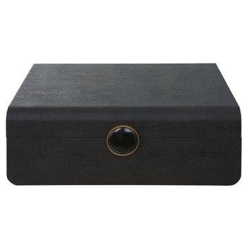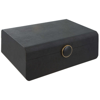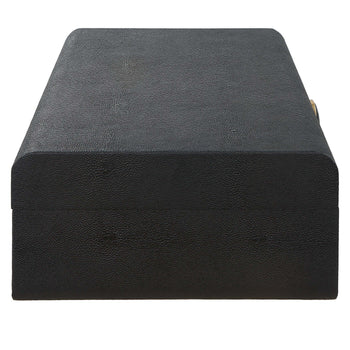 Inspired By The Art Deco Era, This Decorative Box Showcases A Faux Black Shagreen Wrapped Exterior Accented By A Brushed Antique Brass And Black Enamel Closure. The Interior Is Finished In Matte Black.