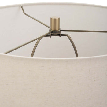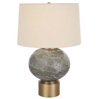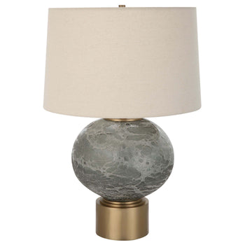 The Lunia Table Lamp Showcases A Beautiful, Smoky Gray Art Glass Center With A Textured Surface, Accented By Antique Brushed Brass Hardware. The Tapered Hardback Shade Is Covered In A Light Oatmeal Linen Fabric With Natural Slubbing.
