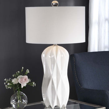 Uttermost's Lamps Combine Premium Quality Materials With Unique High-style Design.With The Advanced Product Engineering And Packaging Reinforcement, Uttermost Maintains Some Of The Lowest Damage Rates In The Industry. Each Product Is Designed, Manufactured And Packaged With Shipping In Mind. Modern Style Emanates From This Table Lamp With An Embossed Geometric Pattern Finished In A Glossy White Glaze Accented With Polished Nickel Details And A Crystal Finial. A Round, Hardback Shade In White Linen Fabric Compliments This Piece.