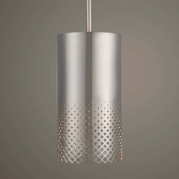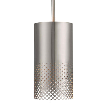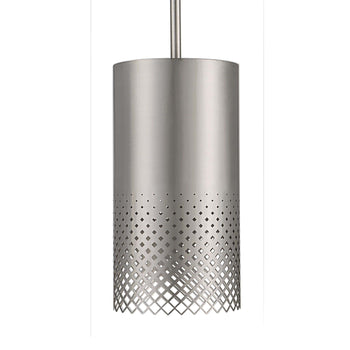 Clean Cylinder Shaped Satin Nickel Pendant With A Unique Laser Cut Ombre Patterned Edge Detail Is A Perfect Fit With Any Modern Decor Look. Includes 1-100 Watt Max Edison Socket. Supplied With 15' Wire, 3-12 Stems And 1-6 Stems For Adjustable Installation.