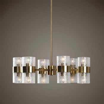Uttermost's Chandeliers Combine Premium Quality Materials With Unique High-style Design.With The Advanced Product Engineering And Packaging Reinforcement, Uttermost Maintains Some Of The Lowest Damage Rates In The Industry. Each Product Is Designed, Manufactured And Packaged With Shipping In Mind. Antique Brass Finish Chandelier Has A Strong Deco Influence In The Design Featuring Thick Textured Clear Glass Cylinder Shades. Includes 12-60w Clear G45 Decorative Bulbs.