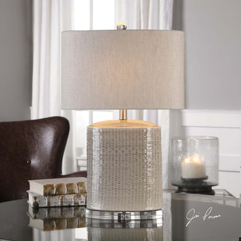 Uttermost's Lamps Combine Premium Quality Materials With Unique High-style Design.With The Advanced Product Engineering And Packaging Reinforcement, Uttermost Maintains Some Of The Lowest Damage Rates In The Industry. Each Product Is Designed, Manufactured And Packaged With Shipping In Mind. Textured, Oval Ceramic Base Finished In A Light Taupe-gray Glaze, With Brushed Nickel Plated Accents And Crystal Details. The Oval Hardback Drum Shade Is A Beige Linen Fabric With Natural Slubbing. Due To The Nature Of Fired Glazes On Ceramic Lamps, Finishes Will Vary Slightly.