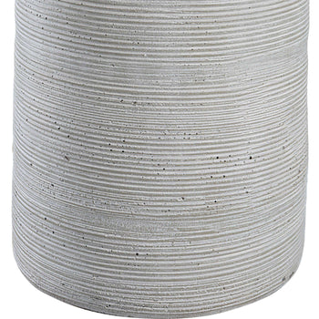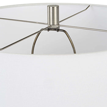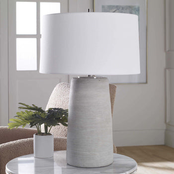 Handcrafted In An Artisanal Style, This Table Lamp Is Formed From Ceramic In Neutral Off-white And Gray Tones With Carved Ring Detailing. Steel Accents Are Finished In A Complementary Brushed Nickel. The Hardback Drum Shade Is Covered In A White Linen Fabric.