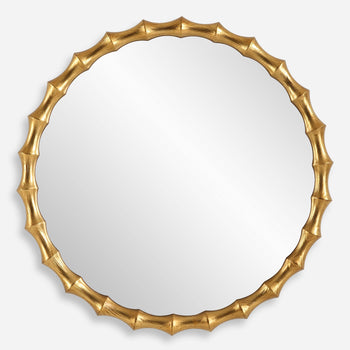 Inspired By The Organic Features Of Bamboo, The Nacala Round Mirror Features A Carved Pinewood Frame Finished In An Antiqued Gold Leaf With Exposed Wood Grain Detailing.