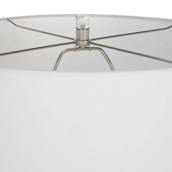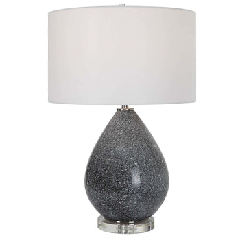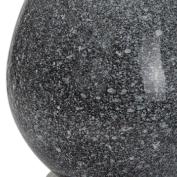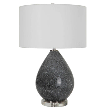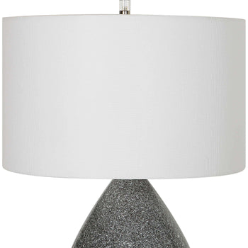This Ceramic Table Lamp Displays A Unique Black And White Speckled Glaze With Polished Nickel Plated Accents And A Thick Crystal Foot. The Lamp Is Paired With A Round Hardback Shade Covered In White Cotton Fabric.