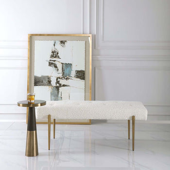 Expertly Tailored In White Faux Shearling, This Glamorous Accent Bench Features A Plush Button Tufted Seat, Atop Four Tapered Stainless Steel Legs Finished In Antique Brushed Brass.