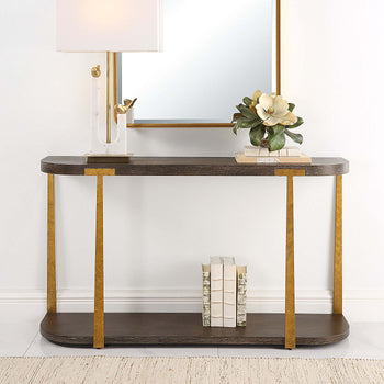 The Palisade Console Table Is Finished In A Rich Coffee Finished Oak Veneer With Natural Wood Grain Details Accented By Forged Metal Columns Finished In Mottled Antique Gold.