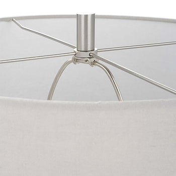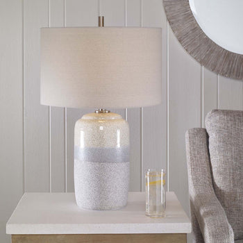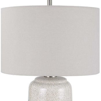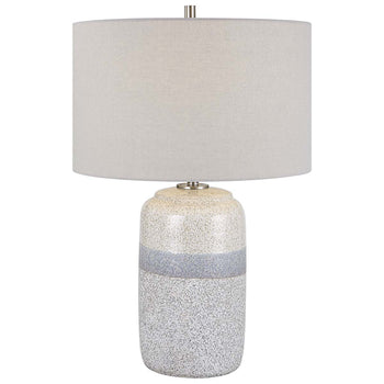 This Ceramic Table Lamp Features A Heavy Mottled White And Gray Bottom Followed By A Cool Gray Center Stripe Topped With A Soft Ivory Cream Accented With Black Specks And Brushed Nickel Plated Details. The Hardback Drum Shade Is Covered In A Light Gray Linen Fabric.