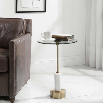 Elegant And Sophisticated, This Round Accent Table Features A Brushed Brass Iron Base With White Marble Details And A Glass Top.