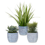 Succulent And Spider Plant Trio Are Accented By Naturally Preserved Moss In Hand Carved Blue And White Ceramic Planters. Sizes: Sm-6x7x6, Med-7x8x7, Lg-22x16x22