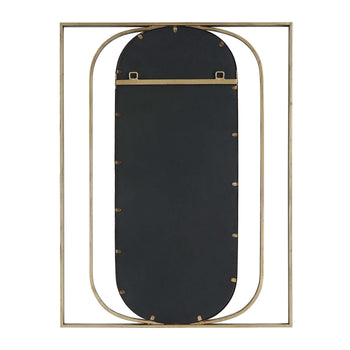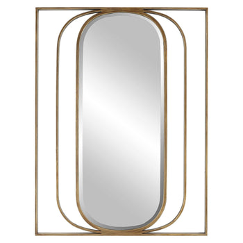 Contemporary Style Mirror Displays A Beveled Oval Interior With An Angular Metal Framework Finished In A Heavily Antiqued Gold. May Be Hung Horizontal Or Vertical.