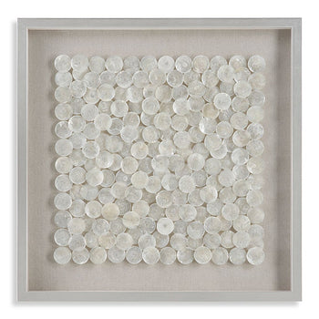 Known As The Windowpane Oyster For It's Transparent Qualities, The Natural Layered Capiz Shells Shimmer In This Shadow Box Style Wall Piece. Placed Over A Flax Toned Linen Backing In A Pine Wood Frame Finished In Brushed Silver.