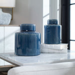 Uttermost's Decorative Bottles & Canisters Combine Premium Quality Materials With Unique High-style Design. This Set Of Two, Sapphire Blue Ceramic Containers Feature A Geometric Pattern With Ivory Undertones And Lift-off Lids. With The Advanced Product Engineering And Packaging Reinforcement, Uttermost Maintains Some Of The Lowest Damage Rates In The Industry. Each Product Is Designed, Manufactured And Packaged With Shipping In Mind. Sizes: Sm-5x8x5, Lg-7x8x7