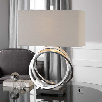 Uttermost's Lamps Combine Premium Quality Materials With Unique High-style Design.With The Advanced Product Engineering And Packaging Reinforcement, Uttermost Maintains Some Of The Lowest Damage Rates In The Industry. Each Product Is Designed, Manufactured And Packaged With Shipping In Mind. Sleek Iron Rings Finished In A Metallic Silver Leaf, Accented With A Rustic Bronze Foot. The Rectangle Hardback Shade Is A Light Beige Linen Fabric.