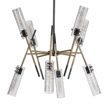 A Dramatic Soft Contemporary Look Blends Straight Lines And Linear Glass To Give Us This Eye-catching 8 Lt. Pendant. Featuring A Combination Finish Of Texture Black And Antique Brass Complementing The Narrow Clear Cylinders Of Glass With Unique Swirled Thread Accents. With 8-60 Watt Max, Edison Sockets And Includes 8-40 Watt Clear T30 Bulbs. Supplied With 15' Wire, 3-12 Stems And 1-6 Stem For Adjustable Installation.